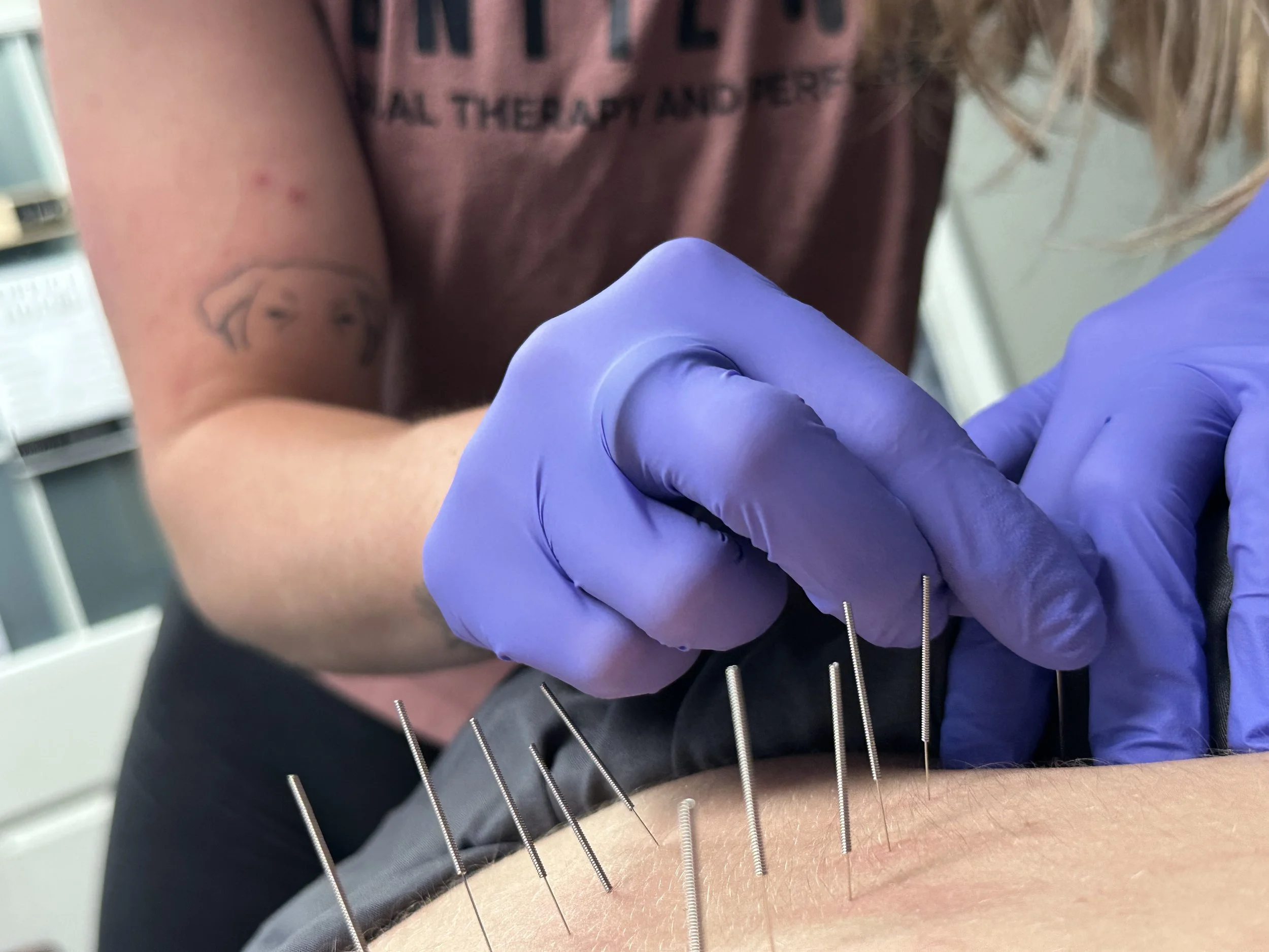 Thin, monofilament (acupuncture) needles placed into the muscle to reduce pain, increase blood flow, and encourage recovery to the irritated tissue.